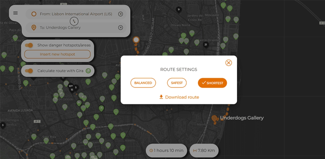 Users can select their route settings as balanced, safest, and shortest based on user preference