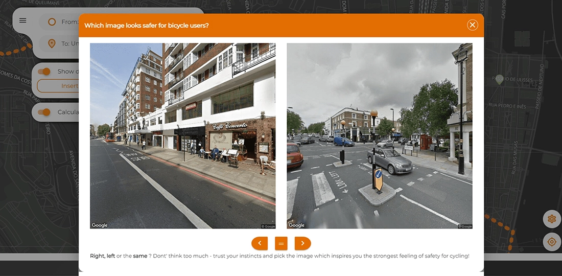 The application's feature involves enhancing bicycle route navigation using user-generated data. Users have the ability to choose and save images of routes they consider safer for bicycle riders. The application utilizes this data to refine its route algorithm, resulting in improved accuracy and safety for subsequent bicycle journeys.